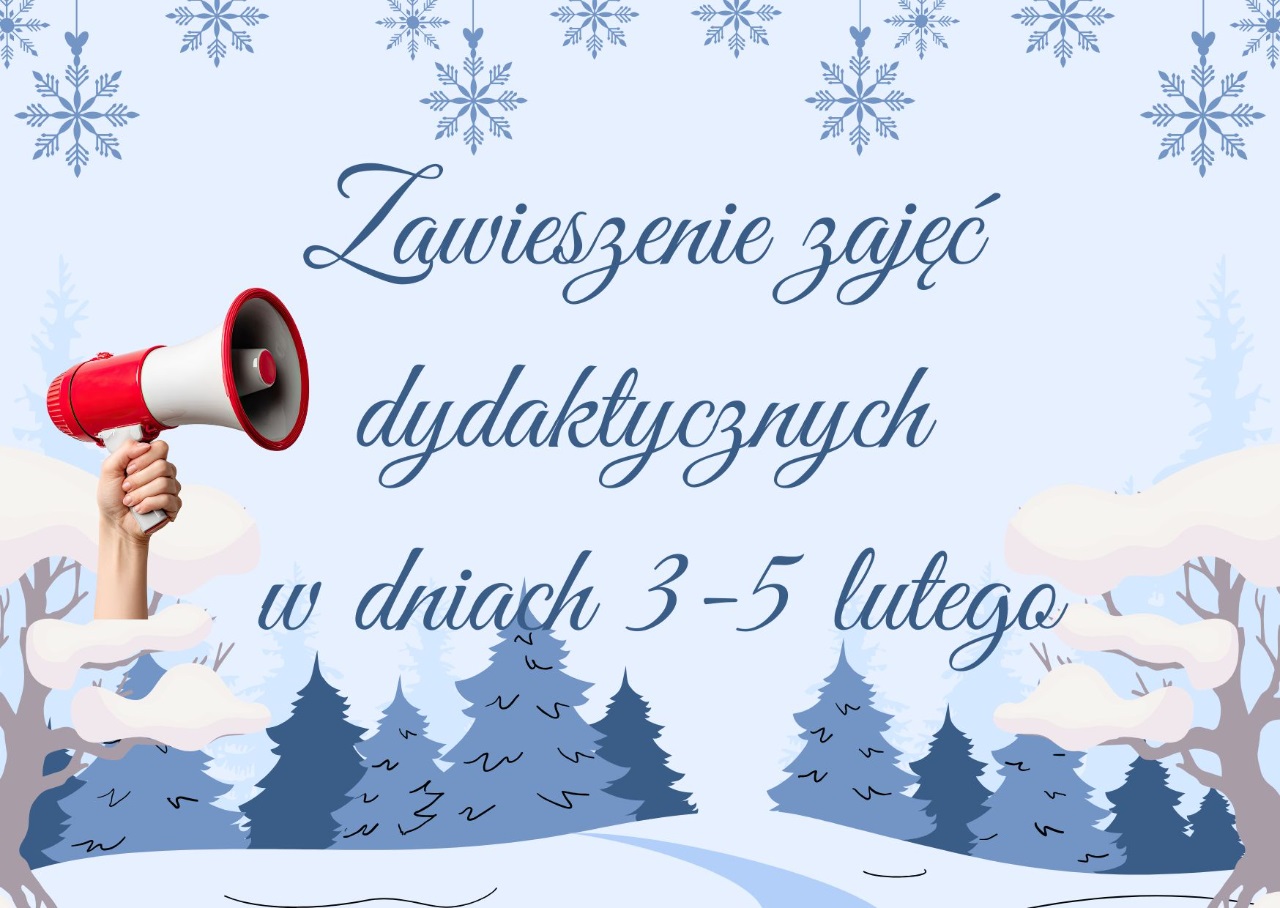 ze względu na awarię w dostawie ciepła oraz decyzję Urzędu Miasta informujemy, że w dniach 3–5 lutego 2026 r. zajęcia dydaktyczne w naszej szkole zostają zawieszone.