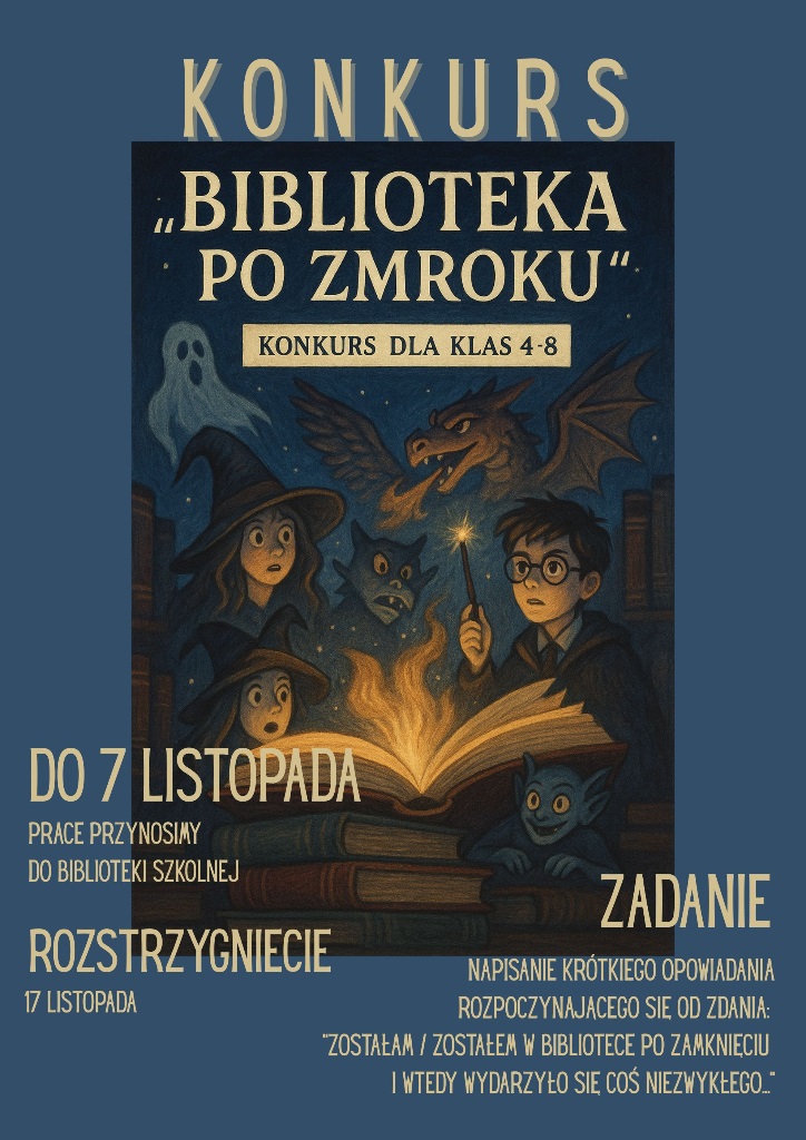 Serdecznie zapraszamy wszystkich uczniów z klas 4–8 do udziału w konkursie literackim „Biblioteka po zmroku”